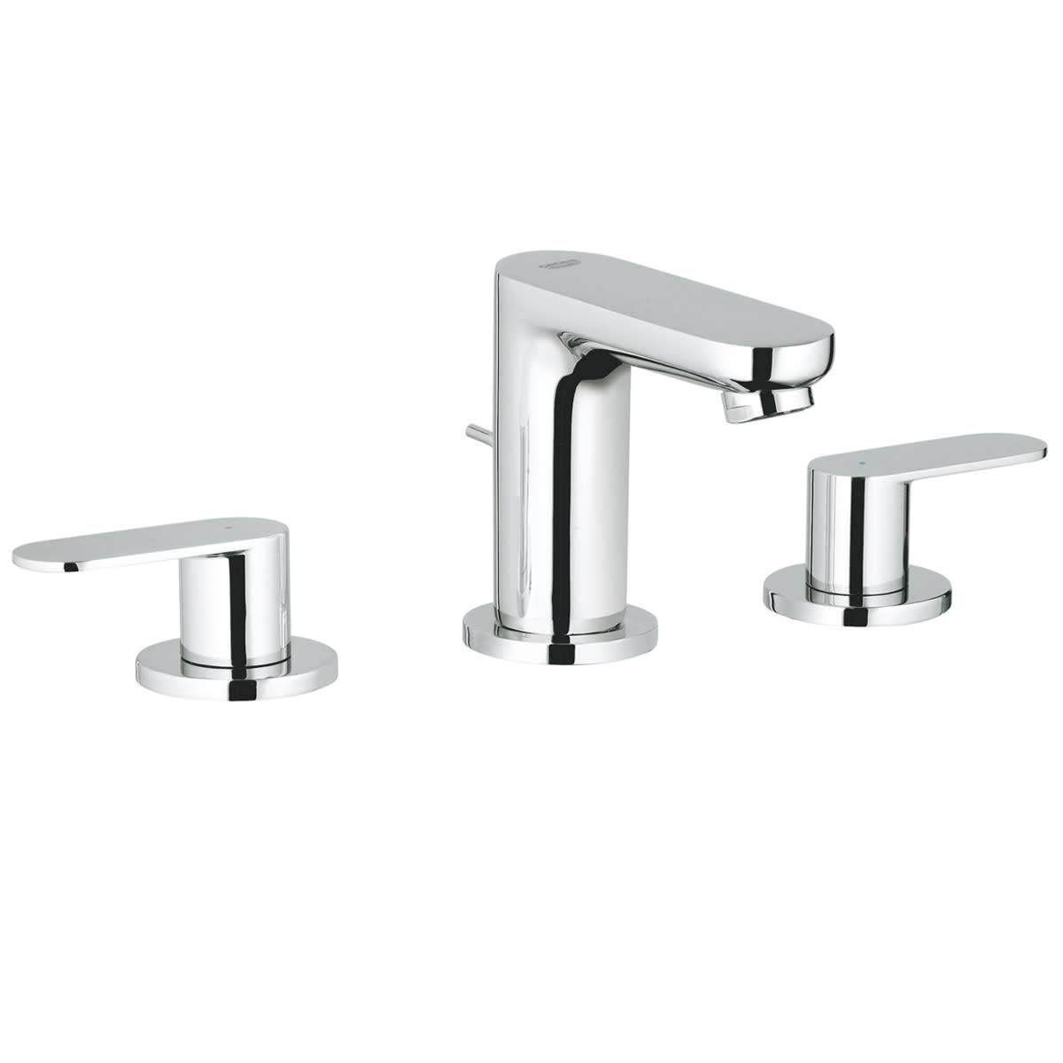 Streamlined and space-conscious, the GROHE Eurosmart Cosmopolitan Widespread Two-Handle Bathroom Faucet brings modern style and the long-lasting dependability of GROHE engineering to your bathroom. Designed for the discerning homeowner, this Eurosmart Widespread Faucet, with solid brass spout, exemplifies GROHE quality inside and out, reflecting clean, minimalist lines and equipped with exclusive GROHE technologies for water conservation, smooth operation, and lasting beauty.
